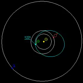 1221 Amor /ˈæmɔːr/ is an asteroid and near-Earth object on an eccentric orbit, approximately 1 kilometer (0.6 miles) in diameter. It is the namesake of the Amor asteroids, the second-largest subgroup of near-Earth objects. It was discovered by Eugène Delporte at the Uccle Observatory in 1932, the first time that an asteroid was seen to approach Earth so closely.[1] The assumed S-type asteroid is one of few low-numbered asteroids for which no rotation period has been determined.[8] It was assigned the provisional designation 1932 EA1 and named for Cupid, also known as "Amor" in Latin, the Roman equivalent of the Greek god Eros.[4]