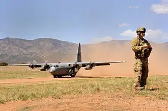 ![]() A 125th Special Tactics Squadron special operations weatherman takes weather readings while a C-130 lands at the Red Devil air strip at Fort Carson, Colorado | |