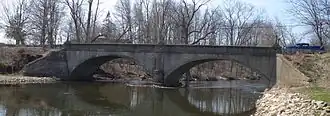 The bridge is in the unincorporated village of Ceresco.[3][6] A dam was previously located just upstream of the bridge, but was demolished in 2014 as part of the cleanup after the Enbridge oil spill.[7] The two-span bridge is 115 feet (35 m) long and has a filled-spandrel concrete arch design. The arches are elliptical barrel vaults trimmed by a projecting string course. The bridge's parapet railings, built of solid concrete, each have ten recesses. At the corners and middle of the railings are concrete lampposts lacking fixtures. At the northwest and southeast corners are affixed bridge plates.[3]