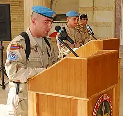 In January 2005, 45 peacekeepers, together with a Polish unit were deployed in Iraq as part of the Multi-National Force – Iraq. They mainly participated in demining, cargo transportation and medical support activities.[15] On November 10, 2006, Senior Lieutenant Georgy Nalbandyan was injured in a mine explosion in Iraq but survived after being transported for surgery to a hospital in Landstuhl, Germany, near Ramstein Air Base.[21] The contingent of 45 peacekeepers of the Armenian Armed Forces were withdrawn from Iraq in November 2009.[15]