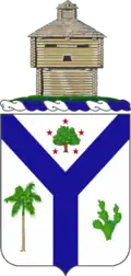 The shield is white charged with the pairle which appears on the shield of the city of Chicago, shield and pairle are white and blue, the Infantry colors. The green oak tree is for Forges Wood and the stars represent the five major operations in which the Regiment took part in France. The palm tree recalls Cuban and the cactus the Mexican border service.