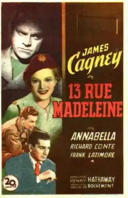 13 Rue Madeleine is a 1947 American World War II spy film directed by Henry Hathaway and starring James Cagney, Annabella, Richard Conte and Frank Latimore. Allied volunteers are trained as spies in the leadup to the invasion of Europe, but one of them is a German double agent.