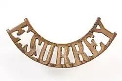 Alderman Archibald Dawnay, Mayor of Wandsworth, and his council offered to raise a complete infantry battalion of 1350 officers and men. The council established a battalion orderly room in the Town Hall. The borough recruiting officer aimed for 200 volunteers from each of Wandsworth's five parishes, and had the use of the East Surrey Regiment's recruiting offices of 31st Regimental District. The recruiting office in Streatham High Road enlisted the first volunteer (a Council employee) for the Wandsworth Battalion (or 'Wandsworth Regulars') on 3 June, long before the battalion was formally authorised by the WO on 16 June as the 13th (Service) Battalion, East Surrey Regiment (Wandsworth). (The East Surrey Regiment was the Regular Army regiment covering South-West London, the pre-war London Regiment consisting entirely of part-time soldiers of the Territorial Force.) As commanding officer (CO), Dawnay obtained Captain Alfred Burton, a former Regular and Territorial Force officer who had rejoined as a paymaster at the outbreak of war. Burton had recently been appointed second-in-command of the 12th (Bermondsey) Bn, East Surreys with the rank of Temporary Major; now he was promoted to Temporary Lieutenant-Colonel and became CO of the Wandsworth Battalion.[4][5][6][7][8][9] Dawnay proposed to Kitchener that the battalion should have its own version of the East Surreys' cap badge, and somewhat unexpectedly this was authorised by the Army Council. The escutcheon and motto ('We Serve') from the coat of arms of Wandsworth were displayed at the centre of the badge, instead of the arms of Guildford, worn more generally by the East Surrey Regiment. The badge was designed by T.C. Willett, the mayor's secretary, and was manufactured by a local firm in Putney.[10][11][12][13]