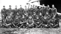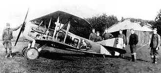 While participating in the St. Mihiel Offensive, which was undertaken to eliminate the salient in the front lines around St. Mihiel that had existed since early in the war, the 13th fought with vigor. While ground forces were attacking and destroying, men, material, and morale, the 13th's pilots kept busy destroying enemy aircraft and balloons, and making the sky safe for Allied observation planes.[4][10] The squadron suffered its first combat loss on 13 September when Lt. Robert Converse was shot down on a late afternoon patrol and reported missing in action. On 14 September 1918 a squadron-strength patrol led by Charles Biddle was ambushed by a flight of the red and white Fokker D VII aircraft of Jasta 18, led by Leutnant der Reserve August Raben, one of a number of times the same two opposing squadrons would meet before the Armistice, starting with the aerial action over the St. Mihiel salient.[11] Six original squadron members were downed in a matter of minutes: Lt. Charles Drew, Lt Alton Brody, Lt. Van H. Burgin, Lt. Thomas Phillips Evans, Lt. Harry B. "Buck" Freeman and Lt. George P. Kull. Lts. Burgin, Converse, Drew, Evans, Freeman and Brody were captured and repatriated after the Armistice. George Kull was confirmed killed in action, the first combat fatality of the 13th Aero Squadron.