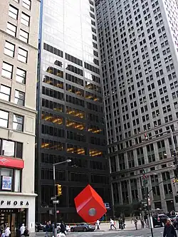 Noguchi's final sculpture, titled The Cube, was installed in 1968. It is a vermilion-hued rhombohedron with a cylindrical hole through its center, standing upon one corner and measuring 28 feet (8.5 m) tall.[6][49][50] The Cube is located off-center, on the north side of the plaza, contrasting with 140 Broadway's dark facade while turning viewers' attention toward the surrounding plaza.[51] Like 140 Broadway, it was detailed by SOM and has an aluminum frame.[52] Bunshaft praised The Cube as "work[ing] beautifully with the building [in] every way",[53] while Metropolitan Museum of Art director Thomas Hoving said that the cube was a sign of "change in public taste".[54]