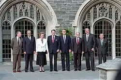 The Group of Seven (G7) was an unofficial forum which brought together the heads of the richest industrialized countries: France, West Germany, Italy, Japan, the United Kingdom, the United States, Canada (since 1976),[2] and the President of the European Commission (starting officially in 1981).[3] The summits were not meant to be linked formally with wider international institutions; and in fact, a mild rebellion against the stiff formality of other international meetings was a part of the genesis of cooperation between France's president Valéry Giscard d'Estaing and West Germany's chancellor Helmut Schmidt as they conceived the first Group of Six (G6) summit in 1975.[4]