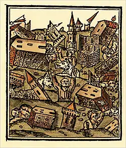 The 1509 Constantinople earthquake or historically Kıyamet-i Sugra ('Minor Judgment Day') occurred in the Sea of Marmara on 10 September 1509 at about 22:00. The earthquake had an estimated magnitude of 7.2 ± 0.3 on the surface-wave magnitude scale.[2] A tsunami and 45 days of aftershocks followed the earthquake. The death toll of this earthquake is poorly known; estimates range between 1,000 and 13,000.