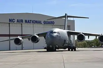 ![]() A Boeing C-17 Globemaster III from the 156th Airlift Squadron, 145th Airlift Wing, North Carolina Air National Guard, on the ramp of the Charlotte Air National Guard Base | |