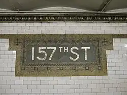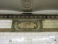 The decorative scheme consists of blue/green tile tablets; buff tile bands; a green terracotta cornice; and buff terracotta plaques.[37]: 40 The mosaic tiles at all original IRT stations were manufactured by the American Encaustic Tile Company, which subcontracted the installations at each station.[37]: 31 The decorative work was performed by tile contractor Manhattan Glass Tile Company and terracotta contractor Atlantic Terra Cotta Company.[37]: 40 The platforms contain their original trim line that includes "157" mosaics and name tablets reading "157TH ST." There are also directional signs on the tiles containing white lettering on a black background and brown border.[41]