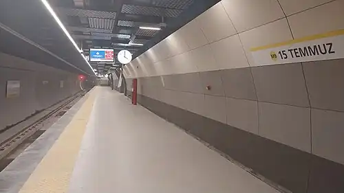 15 Temmuz (15 July) is an underground station on the M9 line of the Istanbul Metro.[1][2] It is located under Gülbahar Street in the 15 July neighbourhood of Bağcılar. It was opened on 18 March 2024, with the extension of M9 from Bahariye to Ataköy.[1]