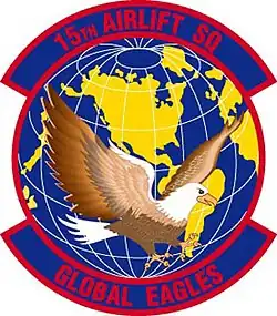 The 15th Airlift Squadron, "Global Eagles", provides combat-ready C-17 aircrews for strategic airlift missions worldwide. The squadron is tasks include emergency nuclear airlift, Presidential support and humanitarian relief efforts.[4]