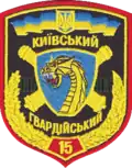Until 2022, before becoming a brigade, the old sleeve insignia of the 15th Rocket Artillery Regiment depicted a shield with a dragon's head, surmounted by a small State Emblem of Ukraine, against a background of crossed cannon barrels. The dragon's head represents the power of missiles.[25]