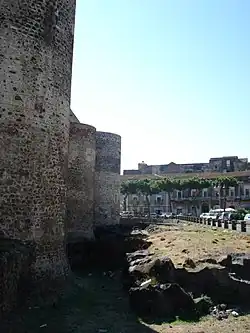 The southeastern branch of the flow, which was fed by lava tubes and ephemeral vents, continued to advance and destroyed farms close to Catania.[20] On 20 March, a branch of the lava flow approached the city and after ponding in[35] and filling the Gurna del Nicito lake,[39] on the 1,[35] 12[40] or 16 April, it reached the city walls[14] about 15 km (9.3 miles) away from the vent.[20] The walls deflected the lava flow southwards[21] and after surrounding the Castello Ursino on 23 April[35] and obliterating the valley that surrounded it,[41] the lava flow began entering the Ionian Sea as a 2 km (1.2-mile)-wide flow front.[35][a]