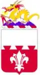 Crest: The many campaigns in which the 169th participated, during the Vietnam War are recalled by the golden dragon, holding an engineer's divider to symbolize the outstanding construction work the unit accomplished in support of military operations during 1967 and 1968. The mountains represent the rugged country in which exacting land development projects were completed and also symbolize the regions in Italy where the unit saw action during World War II, specifically the Po Valley, North Apennines and Rome-Arno. Scarlet denotes courage and recalls three Meritorious Unit Commendations and the Republic of Vietnam Civil Action Honor Medal awarded the 169th in the period 1966 to 1970.