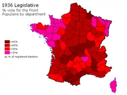 Legislative elections were held in France on 26 April and 3 May 1936, the last elections before World War II. The number of candidates set a record, with 4,807 running for election to the Chamber of Deputies. In the Seine Department alone, there were 1,402 candidates.[1] The legislative election was the last before women were granted the right to vote in April 1944.[2]