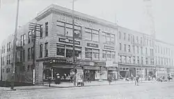 In February 1905, buildings on the site were set to be torn down and replaced with the Jamison Block; the New Bargain Store at the corner of Walnut and High advertised a sell-out sale, announcing it was being forced to vacate.[37] The new Jamison Block building was planned as a four-story red sandstone and buff brick structure, with designs by Monroe Heath Blake.[34] It was also planned to have the High Street entrance arcade and waiting room for the Scioto Valley Traction Company, which built an interurban train station nearby, facing Front Street. The company's officials abandoned the Jamison Block plans when they realized Columbus was no longer "High Street, Ohio" (a one-street town).[31][38] The present-day 185–191 S. High Street was constructed in 1906, known as the Jamison Block.[31] One of its significant tenants was the Bliss Business College, a school formerly located in the Grand Theatre on State Street. The college opened in the new building on September 4, 1906; a Columbus Dispatch article that year reported Bliss would have the only business college in the state occupying a building specifically built for its purpose.[5] The building suffered two fires in April 1910. The second fire destroyed the inventory of the A.G. Spalding & Co.'s store, with losses to other tenants including Bliss College, F.H. Siebert's cigar store, Theresa Hermann's millinery, and K.F. Farrah's store selling Syrian goods.[4] Several months after the fire, in October 1910, W.L. Jamison commissioned architect J.A. Jones to design a garage building behind the Jamison Block. The building is still extant at 200 South Wall Street, standing 62 feet (19 m) square, two stories in height.[39]