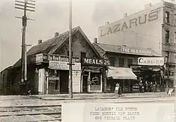 171–177 S. High Street, known as the Old Lazarus Block, was constructed in the 19th century. In 1858, five-term Columbus mayor George J. Karb was born on the building's third floor. The building was remodeled sometime between 1911 and 1915.[6][7] In the 1880s, Pfaff & Co. operated at this address, selling gas fixtures, glass, and queensware. In the 1890s, the Columbus Optical Company and Mme. King's, selling hats and bonnets, operated at this address. Columbus Optical Co. was re-established in 1940, operating at 177 or 191 South High from 1965 into 1982, when it was renamed Tuckerman Optical;[8][9][10][11] the brand was almost entirely bought out by LensCrafters in 1994.[12] In 1895, the F. & R. Lazarus Company constructed a large clocktower on top of the building. The Italian Renaissance Revival-style tower reportedly would increase the building's height to 100 feet, and carry 600 electric lights, along with a 1,000-lb. fire bell connected to the city fire department. The clocktower's plans were by the firm of C. A. Stribling, best known for his work in the firm Stribling & Lum, prominent in Central Ohio.[13][14] Upon installation, the building and its clocktower were heavily adorned with lightbulbs. Together with the electric-lit streetcar arches on High Street, the block became a "miniature white way" every night at that time.[15] In 1909, the Early Motor Car Co. opened in the building.[16] In August 1910, a neighboring building, part of the seven-building Lazarus complex, was torn down for construction of the Ohio National Bank.[17] A few months earlier, Lazarus's clocktower was also demolished. The tower was beloved by locals, and relied on by businesspeople in the area.[18] In 1920, the Republican state headquarters moved into the building, still known as the old Lazarus building.[19] In the 1920s, Korn Hatters operated in the building,[20] and from 1915 to at least 1923, Eddie Gettrost ran a bowling alley, the South High Alleys, in the building.[6][21] There the Columbus Women's Bowling Association held its first city tournament, in 1922, and continued nearly every year into the 1940s.[22]
