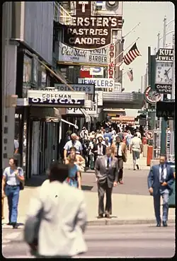 In July 1931, Kroger announced it would open its first store in Downtown Columbus in the building, in a former Lazarus store space.[23] It was also considered the first supermarket in Columbus. The store, at the address of 177–179 S. High Street, had two exterior entrances, and an entrance from the lobby of 175. Its opening night, on November 7, 1931, reportedly drew in 2,600 people, with 7,205 sales registered that day.[24][25] The opening was paired with an 18-page section about the new supermarket in The Columbus Dispatch. The new store was described there as "ultra modern", "the latest development in food service", and "one of the finest retail centers" for groceries in the Midwest, and was advertised as "the last word in grocery service". The storefront utilized black vitrolite, with chromium-plated lettering for Kroger in a modern font. The interior, finished in two shades of pea green, had a fountain, luncheonette, fresh fruit, baked goods, and candy, cigarette, and tobacco counters. The store also had meat, fish and game, and delicatessen departments.[26][27] In 1932, the publication Chain Store Management featured the store for its complete shopping experience, leading a trend toward grocery chains in downtown districts, especially those located near department stores and movie theaters.[28] From 1988 to 2000, the Central Ohio Transit Authority operated a customer service center in the building.[29][30]