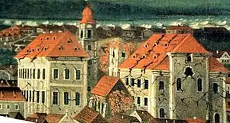 Damage in Komárom was extensive, with 279 houses completely collapsing out of the 1169 houses in the city. A further 353 houses suffered partial collapse, 213 required major repairs and 219 needed only minor repairs. Multistory buildings were particularly badly affected. The houses in the city were described as strongly-built before the earthquake due to the possibility of coming under siege.[5] Contemporary reports note that seven churches collapsed and that the newly constructed Jesuit church and college were heavily damaged, including the collapse of two towers onto a neighboring school, which killed several people.[10][5]