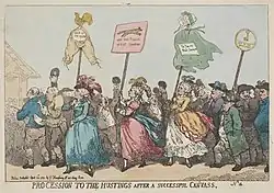 The election was notable for being one of the first in history in which visual propaganda, in the form of caricatures satirising or promoting the candidates, played a significant role. Caricatures appeared almost daily, allowing the young artists Thomas Rowlandson and James Gillray both to make their names on the strength of their satirical output. After the election, one of the leading London print sellers William Humphrey, gathered together a number the election plates to illustrate a detailed blow-by-blow account of the election.[1] It quickly ran to a second edition.