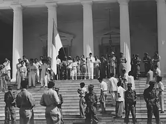 Shortly after the crowd's arrival, President Sukarno walked out and addressed the crowd from the steps of the presidential palace, promising elections in the short term. However, Sukarno denied the demonstrators' request to dissolve parliament, stating that such actions would be dictatorial. This speech largely managed to calm down the demonstrators, and after the conclusion of his speech, he received cheers, and the crowd largely dispersed.[16] Sometime past 10 AM, seventeen high-ranking officers, including five of the seven army territorial commanders, met the president. The closed-door meeting lasted for an hour and a half and also involved Hatta, Wilopo, Cabinet Secretary A.K. Pringgodigdo, and parliament speaker A. M. Tambunan.[20] The army officers demanded the president dissolve parliament.[21] According to historian Ruth McVey, the officers would have likely accepted a compromise, whereas the parliament would remain but would no longer interfere with army leadership.[22] Sukarno, however, refused to either dissolve parliament, to make public statements supporting the army, or to propose a compromise otherwise, and he sent away the officers after previously promising that he would satisfy all parties.[21][22]