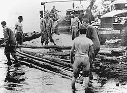 The 17th Marine Regiment participated in the Battle of Cape Gloucester.[4] The subordinate battalions, as independent battalions in 1st Marine Division, participated in all of the Division's major operations during the war. According to the 19th CB's log it was assigned to the 1st Marine 11/05/42 prior to leaving the States. On 04/03/43 "By Division General Order No. 74 of 3 Apr'43 - First Marine Division: the 19th CBs designation will be as follow's in the future, when attached to First Marine Div., Fleet Marine Force ----3rd Battalion, 17th Marines (Engineers) c/o FPO San Francisco. Calif."[5] The 19th was "at Cape Gloucester from 27 Dec 43 until 4 May 44"[5] and remained with the 1st Division until "1 Jul'44 when The 19th CB was detached from the operational control of the 1st MarDiv, re-designated the 19th NCB and transferred to the 3rd Marine Amphibious Corps.[5]
