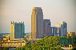 The District's office space is located along the six-lane 17th Street Corridor, and is home to the 22-story tall 171 17th Street, known as the Wells Fargo Building and completed in 2004, and the 17-story 201 17th Street, completed in 2007. Developed by AIG Global Real Estate, 171 17th Street was awarded the silver certificate in the U.S. Green Building Council's Leadership in Energy and Environmental Design (LEED) Core and Shell Development program. 171 17th Street became the first-ever LEED Silver-Core and Shell certified high-rise office building,[15] and the first high-rise office building in Georgia to receive any LEED certification. The 25-story BB&T Tower at 271 17th Street was completed in 2009, becoming Atlantic Station's tallest office tower.[16] 271 was designed by tvsdesign and built by Brasfield & Gorrie.