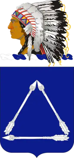 That for the regiments and separate battalions of the Oklahoma Army National Guard: From a wreath Argent and Azure an Indian's head with war bonnet all Proper.