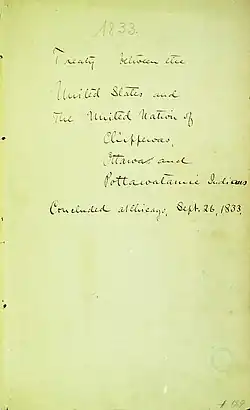 - ^ a b c d "Ratified Indian Treaty 189: United Chippewa, Ottawa and Potawatomi – Chicago, Illinois, September 26, 1833". National Archives Catalog. National Archives and Records Administration. Retrieved August 28, 2022.
