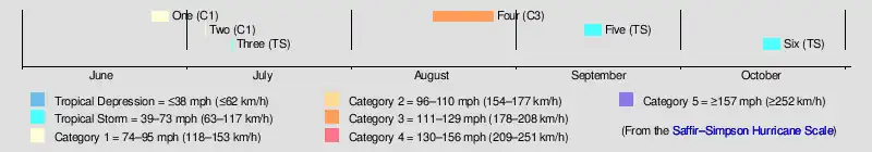 Five of the six tropical cyclones affected land, including three making landfall with winds of over 74 mph (119 km/h). The first struck Texas as a hurricane, which caused moderate to heavy damage, particularly to shipping in Matagorda Bay. One death was indirectly related to the hurricane, as well as at least two injuries.[3]