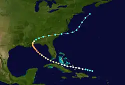 A moderately strong hurricane with winds of 105 mph (165 km/h) was first spotted on October 6 east of Jamaica. Passing a short distance south of the island, the hurricane tracked northwestward and brushed the Yucatán Peninsula before turning north-northeastward into the Gulf of Mexico.[1] Late on October 9, it made landfall a short distance east of Apalachicola, Florida, at peak winds with an estimated pressure of 965 mbar (28.5 inHg).[14] Rapidly weakening to tropical storm status, the cyclone continued northeastward and emerged into the Atlantic Ocean from North Carolina on October 11. Later that day, it was last observed about 250 mi (400 km) southeast of Cape Cod.[1]