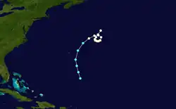 The sixth hurricane of the season was first observed as a tropical storm to the southeast of Bermuda on September 26.[10] Initially, the storm headed north-northwestward, before curving north-northeastward on September 27, while bypassing Bermuda. Later that day, the storm strengthened into a hurricane.[2] The brig Samuel and Edward encountered the hurricane on September 2, reporting winds of 80 mph (130 km/h); this was the maximum sustained wind speed associated with the storm. Thereafter, the storm executed a cyclonic loop, which lasted until September 30.[11][2] It curved northeastward on October 1 and was last noted at 0600 UTC, while located about 590 miles (950 km) northeast of Bermuda.[2]