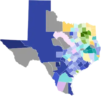 Results by county:[1][a]Pease: 30-40% 40-50% 50-60% 60-70% 70-80% 80-90% >90%Ochiltree: 30-40% 40-50% 50-60%Wood: 20-30% 30-40% 40-50% 50-60% 60-70% 70-80% 80-90%Evans: 20-30% 30-40% 40-50% 50-60% 60-70% 80-90%Chambers: 20-30% 30-40% 40-50% |