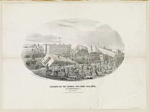 The 1855 Camden & Amboy rail accident was a derailment that took place near Burlington, New Jersey on August 29, 1855. While attempting to avoid collision with another train, a Philadelphia-bound express was reversing when it collided a horse-drawn cart resulting in the rear passenger train coaches to derail and shatter into pieces. 24 people would die as a result of the crash.[1]
