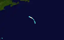 A sixth tropical storm was first observed by the brig Caroline E. Kelly on September 18, which experienced a heavy gale while located about 930 mi (1,495 km) east-southeast of Bermuda.[2] With initial winds of 60 mph (95 km/h), the storm slowly strengthened while moving north-northwestward. At 1200 UTC on September 19, it reached hurricane status and peaked with winds of 80 mph (130 km/h). The storm decelerated and remained at this intensity for over 24 hours. Late on September 21, the system re-curved westward and weakened to a tropical storm.[3] It was last seen by the Pride of the Sea on September 22,[18] while located about 695 mi (1,120 km) south of Cape Race, Newfoundland.[3]