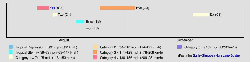 | Five | August 25 – September 3 | Category 3 hurricane | 115 (185) | 969 | Southeastern United States | Unknown | None | |||