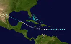 The final tropical cyclone was first observed at 0000 UTC on September 24, while located about 420 miles (680 km) east of Guadeloupe. Initially a tropical storm, it strengthened slightly before crossing the Leeward Islands on September 25.[7] In Guadeloupe, several ships at the port in Basseterre were swept out to sea.[15] Continuing eastward, the storm soon entered the Caribbean Sea. Early on September 26, the system strengthened into a hurricane.[7] By September 28, it was west of the Cayman Islands and had reached Category 2 strength. The storm weakened to a tropical storm after passing Cancún early on September 29 and impacted the Gulf coastline, near the United States–Mexico border, at that strength the next day before dissipating.[7] At Port Isabel, Texas, several hundred homes were swept away, and several towns near the mouth of the Rio Grande also sustained damage.[16]