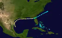 Early on August 2, the ship Suwanee encountered a hurricane over the central Caribbean Sea. The storm reached an estimated peak intensity of 105 mph (165 km/h), making it a Category 2 hurricane. However, with no other reports available, this storm is represented by only a single data point.[3] Chenoweth proposed that this cyclone instead developed on August 10 near the Florida Keys. After striking near Mexico Beach, Florida, as a tropical storm late on August 13, the system moved generally northeastward across the United States until becoming extratropical over eastern Pennsylvania on August 16.[6]