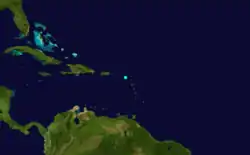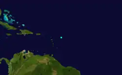 This tropical storm is known from having wrecked the schooner Three Sisters on the night of October 9 at Saint Martin in the eastern Caribbean.[24] Neither Fernández-Partagás and Diaz nor the Atlantic hurricane reanalysis project could construct a track beyond the single point, with the cyclone possessing sustained winds of 45 mph (75 km/h).[3] The storm may have been associated with other weather reports in the Lesser Antilles. For example, Barbados recorded 7 in (180 mm) of precipitation on October 7.[24] Some ships were wrecked in the Lesser Antilles, especially on Martinique, which also reported damage to ships, plantations, and several buildings.[25] Puerto Rico also reported flooding and shipwrecks on October 13. However, it is uncertain if impacts in any areas other than Saint Martin were related to the cyclone.[24] Chenoweth traced this cyclone back October 8 as a tropical storm just east of the Windward Islands, passing over Martinique that day. The storm intensified into a hurricane and clipped Puerto Rico before striking the Dominican Republic. Another landfall occurred on Cuba as a tropical storm, before the system dissipated over the island on October 12.[6]