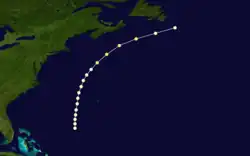 The first known tropical cyclone of the season was observed on September 3, about halfway between the Bahamas and Bermuda.[1] A nearby ship estimated winds of 80 mph (130 km), indicating the presence of the hurricane.[4] It moved northward initially, passing about 220 mi (350 km) west of Bermuda on September 4. Thereafter, the hurricane turned toward the northeast,[1] and the ship "John Richardson" encountered gale force winds on September 5, resulting in a wreck of its cargo.[2] On September 6, it was estimated to have reached peak winds of 105 mph (169 km/h), based on observations from the ship with the call sign "Greenock".[4] The hurricane lashed the ship with strong winds for 14 hours, killing the captain and one crewman. At the time, it was about 400 mi (640 km) southeast of Halifax, Nova Scotia.[2] Turning to the northeast, the hurricane passed south of Newfoundland before last being observed on September 7.[1]