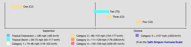 As the previous storm was moving along the coastline of the southeastern United States, a new hurricane was observed in the western Caribbean Sea, about halfway between Honduras and Jamaica. Its intensity, based on a ship report, was estimated at 105 mph (169 km/h). The hurricane moved slowly west-northwestward, and another ship experienced its strong winds on October 7. There were no further observations, so its complete track is unknown.[1][2]