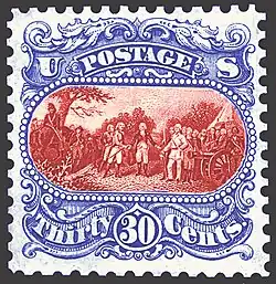 The term "pictorial" denotes a revolutionary aspect of the 1869 series. Here the designers rethought the concept of what constituted an appropriate stamp subject, changing the established convention that U.S. postage stamps should present images only of dead statesmen. Such statesman-portraits appear, in fact, on only three values of the pictorial issue: the 1-cent Franklin, the 6-cent Washington and the 90-cent Lincoln. The other seven denominations contain a variety of images. Three stamps illustrate means of postal transportation: delivery on horseback (2 cent), by locomotive (3 cent) and by steamship (12 cent). Two others present historical tableaux drawn from famous paintings of crucial hemispheric events: John Vanderlyn's Landing of Columbus (15 cent) and John Trumbull's Declaration of Independence (24 cent). The 30 cent was designed to be similar to the 15 cent and 24 cent stamps. It was to use a vignette that showed the British surrender after the Battle of Saratoga in 1777. The Post Office decided at the last minute not to annoy the British and so used the 10 cent Patriotic Eagle and Shield design again with the addition of flags.[4] An innovation no less striking of the 1869 pictorials was the introduction of the first two-color stamps of U.S. postal history, on the four denominations of 15 cents and greater. Each color had to be printed separately; and on a few sheets of the 15-cent, 24-cent and 30-cent stamps, the paper was placed in the press upside down for the second printing, resulting in America's first invert errors.[5] These error stamps command high prices: at an auction in early 2011, used copies of the three inverts realized a total of a quarter of a million U.S. dollars.[6]