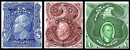 The 1869 pictorials had a brief moment of re-exposure when reprints of them appeared in 1875 (the Post Office that year reprinted many of its old issues, intending to display every U.S. postage stamp ever produced in its exhibit at the Philadelphia Centennial Exposition in 1876). In contrast to the rejection these designs met in 1869, centennial collectors welcomed the reprints and hastened to acquire them. The most obvious distinction between the originals and the 1875 versions is that the latter have no grills. Another difference is that yet a third type of the 15-cent stamp now appeared, similar in framing to the first 1869 version, but with some shading behind the vignette removed.[3] Used re-issues are much less common than the regular issues – there are around 5,000 used 90 cent compared with about 40 re-issues. There are fewer than 500 used examples in total for the ten denominations, fewer than 100 of any one denomination. The 3 cent Locomotive is the rarest re-issue, with about 16 copies known, followed by the 12 cent with about 20.[4]