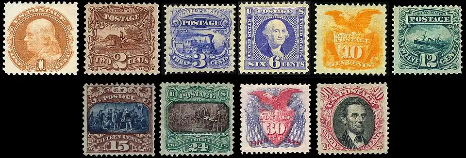 The 1869 Pictorial Issue is a series of definitive United States postage stamps released during the first weeks of the Grant administration. Ten types of stamp in denominations between one cent and ninety cents were initially offered in the series, with eight of these introduced on March 19 and 20, 1869 and the two greatest values being distributed somewhat later.[1] During May, however, the Post Office began distributing a revised version of the 15-cent stamp, in which the original, poorly aligned frame had been modified (a diamond shape was added above the vignette); and collectors consider this eleventh stamp an integral part of the Pictorial Issue. The two 15-cent stamps were assigned separate Scott Catalogue numbers: 118 and 119.[2][3]