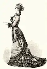 - Dress of 1874 with draped overskirt and ruffled underskirt.