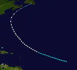 The bark Colchaqua encountered this storm nearly 900 mi (1,450 km) west of the Capo Verde Islands on August 29, recording sustained winds of 46 mph (74 km/h).[13] Moving towards the west-northwest, the storm steadily gained strength, and reached hurricane strength early on September 2. The storm peaked its peak intensity of September 6 with sustained winds of 90 mph (150 km/h) and a minimum atmospheric pressure of 980 mbar (29 inHg),[3] the former recorded by the ship Swallow and the latter by the ship State of Virginia.[13] Moving just to the west of Bermuda, the cyclone began to turn more northerly, and transitioned into an extratropical cyclone later on September 7. By the following day, the system made landfall in Newfoundland as an extratropical system.[3] On Bermuda, the hurricane generated huge swells and strong winds, causing sea spray that defoliated plants across the territory.[14]: 5 Approximately 1 in (25 mm) of rain fell in Halifax, Nova Scotia, during a 3.5 hour-period as a result of the storm.[11]: 37 The 2014 reanalysis study by Chenoweth concludes that this storm formed on September 2 and intensified more than HURDAT suggests, peaking as a strong Category 2 hurricane.[5]