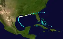 Although the Monthly Weather Review reported decreasing atmospheric pressures over the Gulf of Mexico as early as the night of September 12,[6] the track for this storm begins on September 14 about 110 mi (175 km) west-northwest of the Yucatán Peninsula. Initially moving northwestward, the cyclone turned northward on September 16, roughly 24 hours before it intensified into a hurricane. Later on September 17, the hurricane curved east-northeastward while just offshore Texas.[3] At 16:00 UTC the next day, the storm made landfall to the southwest of Cocodrie, Louisiana, with maximum sustained winds of 80 mph (130 km/h) and an estimated minimum pressure of 982 mbar (29.0 inHg).[3][4] On September 19 the hurricane made another landfall at Fort Walton Beach, Florida. It quickly weakened back to a tropical storm while still in the state of Florida. After emerging into the Atlantic on September 20, the storm was last noted the next day roughly 175 mi (280 km) southeast of Cape Fear, North Carolina.[3]