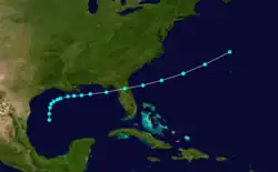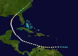 On September 21, a tropical storm was first observed east of Grenada and Saint Vincent.[17] Moving westward at a low latitude, the cyclone intensified into a hurricane early the next day while moving between Grenada and Tobago. The storm then remained close to the coast of South America while strengthening, becoming a Category 2 hurricane on the present-day Saffir–Simpson scale on September 23. Early on the next day, the system curved west-northwestward before striking Venezuela's Paraguaná Peninsula and Colombia's Guajira Peninsula. The cyclone turned northwestward by September 26, passing near the northeast tip of Mexico's Yucatán Peninsula.[3] Upon reaching the central Gulf of Mexico, the storm began trekking to the north-northeast on October 1 and then to the northeast by the next day.[3]