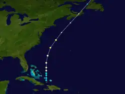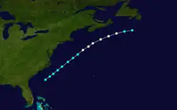 Although the schooner O. S. Bailey reported gales on November 17,[31] the track listed in HURDAT begins on the next day over the southeastern Bahamas about 35 mi (55 km) north of Inagua. Around 00:00 UTC on November 19, the storm intensified into a hurricane while moving northward. About 24 hours later, it is estimated that the cyclone intensified into a Category 2 hurricane with winds of 105 mph (165 km/h). However, around 12:00 UTC on November 20, the storm transitioned into an extratropical cyclone about 185 mi (300 km) southeast of Nantucket, Massachusetts.[3] Later that day, Halifax, Nova Scotia, recorded a barometric pressure of 968 mbar (28.6 inHg), forming the basis for the peak intensity estimate while the storm was still a tropical cyclone.[32][5]