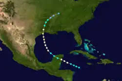 Benito Viñes documented this storm over the northwestern Caribbean as early as August 19.[22] Moving west-northwestward, the cyclone intensified into a hurricane on at 00:00 UTC on August 20,[3] according to reports from the ship Elvina.[5] About 12 hours later, the hurricane made landfall in Mexico near Felipe Carrillo Puerto, Quintana Roo, with winds of 80 mph (130 km/h). The hurricane weakened to a tropical storm late on August 20, but re-strengthened into a hurricane in the Gulf of Mexico the next day. Turning north-northwestward, the cyclone strengthened into a Category 2 hurricane on August 22, and made landfall near present-day High Island, Texas, early on August 23.[3] Based on a barometric pressure of 988 mbar (29.2 inHg) at Shreveport, Louisiana, the hurricane is estimated to have possessed sustained winds of 105 mph (165 km/h) and a barometric pressure of 964 mbar (28.5 inHg).[5] The system weakened to a tropical storm later on August 23 and then to a tropical depression early on August 24, before dissipating over Kentucky several hours later.[3]